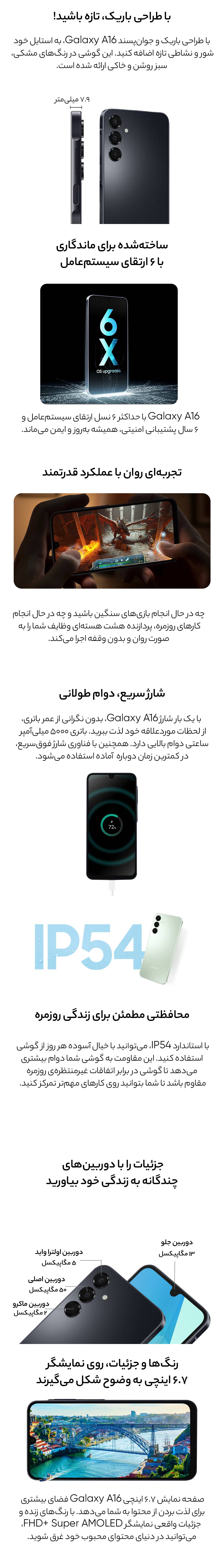 A16 4G یک گوشی میانرده-اقتصادی جذاب از سامسونگ است که با طراحی مدرن، نمایشگر باکیفیت و نرمافزار بهروز عرضه شده است. این گوشی با وزن 200 گرم، ظاهر شیکی دارد و گواهی IP54 آن را در برابر گرد و غبار و پاشش آب مقاوم کرده است. حسگر اثر انگشت روی لبه گوشی هم امنیت گوشی را افزایش داده است. نمایشگر 6.7 اینچی Super AMOLED با نرخ نوسازی 90 هرتز، تصاویر را با وضوح و رنگهای زنده نمایش میدهد. پردازنده هشت هستهای عملکرد مناسبی برای کارهای روزمره و بازیهای سبک فراهم میکند. همچنین در این گوشی امکان ارتقاء حافظه با کارت حافظه جانبی microSD وجود دارد. دوربین سهگانه شامل دوربین اصلی 50مگاپیکسلی، دوربین فوق عریض 5 مگاپیکسلی و دوربین ماکرو 2 مگاپیکسلی است. این دوربینها عکسهای نسبتا خوبی در شرایط نوری مناسب ثبت میکنند. دوربین سلفی13 مگاپیکسلی هم برای ثبت عکسهای روزمره و تماسهای ویدئویی مناسب است. این گوشی با سیستمعامل Android 14 و رابط کاربری One UI 6.1 عرضه شده و سامسونگ قول پشتیبانی نرمافزاری 6 ساله را داده است. باتری 5000 میلیآمپرساعتی و شارژ سریع 25 واتی نیز یک روز کامل استفاده را تضمین میکند. به طور کلی A16 4G با ویژگیهای مدرن و قیمت مناسب، یک انتخاب قدرتمند در میان گوشیهای اقتصادی-میانرده سامسونگ است.