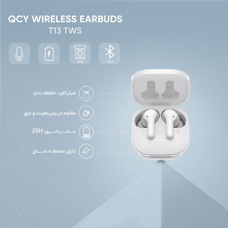 یکی دیگر از ویژگیهای مهم QCY T13 TWS، مقاومت در برابر آب با استاندارد IPX5 است. این ویژگی باعث میشود که هدفونها در برابر تعریق و رطوبت مقاوم باشند و بتوانید با خیال راحت در هنگام ورزش و فعالیتهای خارج از منزل از آنها استفاده کنید.