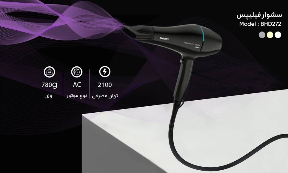 سشوار فیلیپس مدل BHD272، از سری سشوارهای نیمه حرفهای شرکت فیلیپس است. این دستگاه دارای موتور AC است که قدرت 2100 واتی دارد. در کنار این دستگاه، یک عدد نازل باریک برای متمرکز کردن باد سشوار ارائه میشود که به وسیله آن میتوانید موهای خود را به دلخواه حالت دهید. مانند اکثر سشوارهای باکیفیت و بهینه، این دستگاه نیز قابلیت تولید یون دارد که از پریشانی و وز شدن موها جلوگیری میکند و عملکرد دستگاه را بالاتر میبرد. از ویژگیهای مهم این دستگاه باید به سرعت باد تولیدی آن اشاره کرد که تا 130 کیلومتر بر ساعت میرسد که در نوع خود منحصربهفرد است. سشوار فیلیپس مدل BHD272 دارای شش حالت تنظیم سرعت/دما است که بنا به دلخواه شما قابل تغییر است. در پایان این نکته قابل ذکر است که سیم برق این دستگاه 1.8 متر طول دارد و حلقهای جهت آویختن نیز روی آن تعبیه شده است.