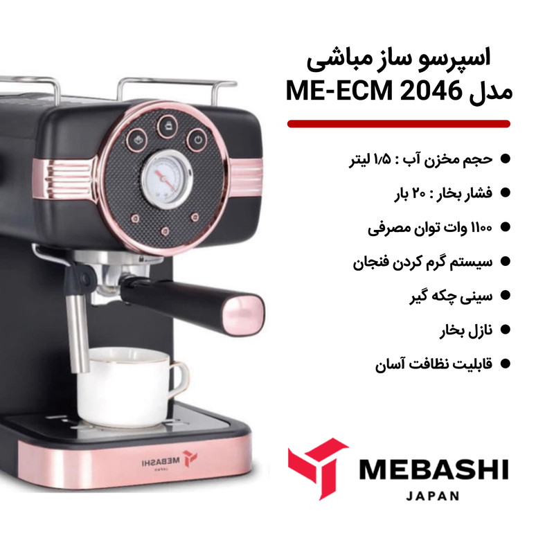 اسپرسوساز مباشی مدل ECM 2046 یکی از محصولات جدید و جذاب و محبوب کمپانی مباشی است که با بدنه پلاستیک فشرده مقاوم و طراحی متفاوت در اواخر سال 2023 به بازار عرضه شده. از جمله ویژگی های این اسپرسوساز داشتن موتور با فشار 20 بار و ظرفیت 1100 وات است. نتیجه ی آن قهوه خروجی با غلظت عالی است. بخار خروجی دستگاه نیز فوق العاده قوی میباشد. این اسپرسوساز مجهز به پیچ تنظیم بخار است، که امکان تهیه فوم شیر با غلظت های متفاوت را فراهم میسازد. از دیگر ویژگیهای این دستگاه داشتن نشانگر عقربه ای دما و قسمت جلوی دستگاه از رنگ رزگلد استفاده شده که هم به دستگاه زیبایی خاصی داده و هم اینکه کاربر راحت تر میتواند با دستگاه کار کند. اسپرسوساز مباشی مدل ECM 2046 در سه رنگ مشکی ، قرمز و سفید به بازار عرضه شده. این دستگاه با طراحی بسیار جذاب و عالی یکی از بهترین اسپرسوسازها برای مصارف خانگی و سوپرمارکت ها است. حجم مخزن دستگاه 1.5 لیتر و از طلق شفاف در ساخت آن جهت مشاهده میزان آب داخل مخزن استفاده شده است. همچنین از فیلتر فولاد مقاوم استفاده شده است. این مدل دستگاه از گرمای بیش از حد جلوگیری کرده و بصورت اتوماتیک خاموش میشود.