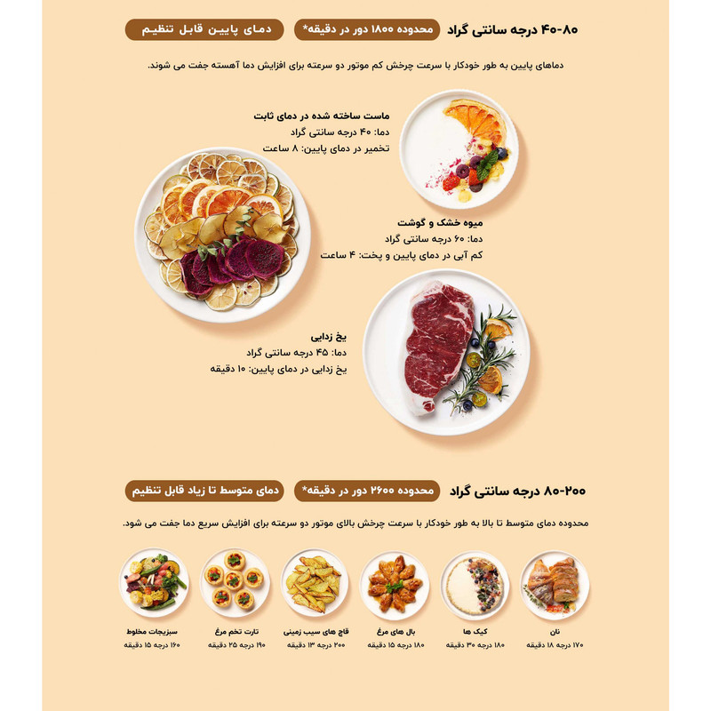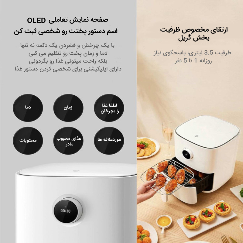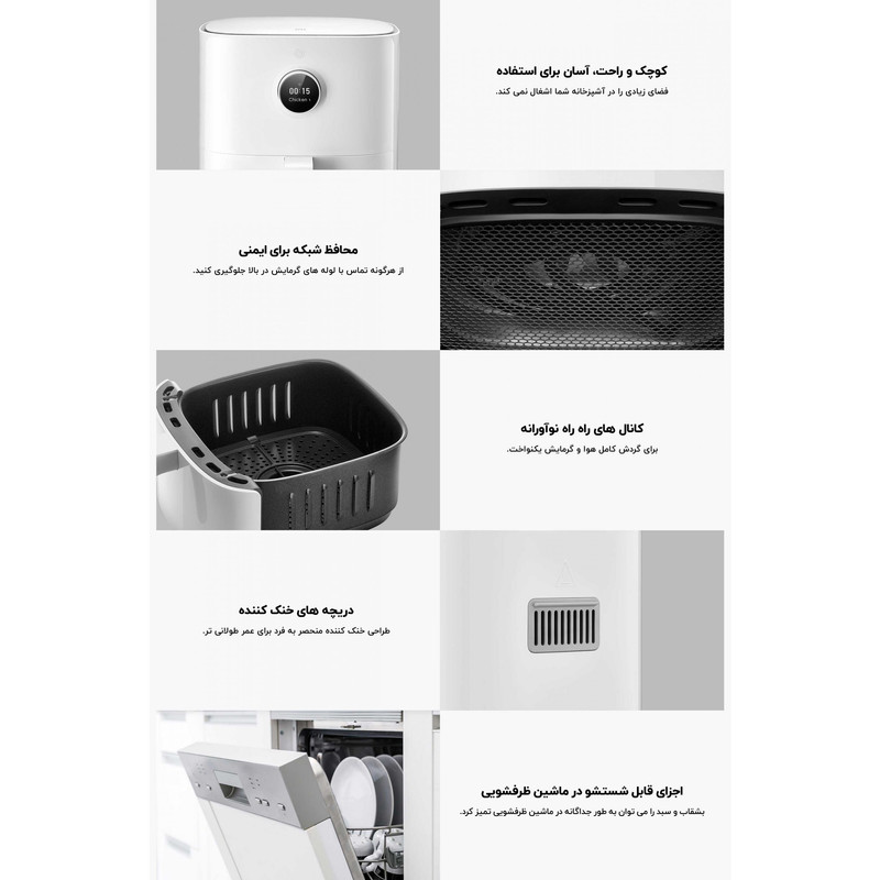 | سایر توضیحات | قابلیت تنظیم دما از 40 تا 200 درجه سانتیگراد /قابلیت پخت مداوم تا 24 ساعت /قابلیت کنترل از راه دور با اپلیکیشن Mi Home /قابلیت یادآوری برگرداندن غذا هنگام پخت /آشپزی سالم با روغن کمتر /دارای برنامه سرخ کردن، پختن، خشک کردن میوه /مناسب برای درست کردن انواع غذاها از جمله سبزیجات، سیب زمینی، کیک، بال مرغ، گوشت و ماست ساز /پخت غذا با جریان هوای گرم 360 درجه /برنامه ریزی هوشمند تا 24 ساعت /قابلیت تنظیم از قبل و دریافت غذای آماده پس از رسیدن به خانه /دارای روکش نچسب دولایه /گردش سریع هوای گرم /پخت یکنواخت غذا /ایجاد لایه ترد بیرونی و نرمی داخل غذا /مجهز به فن دو سرعته /پشتیبانی از Google Assistant |