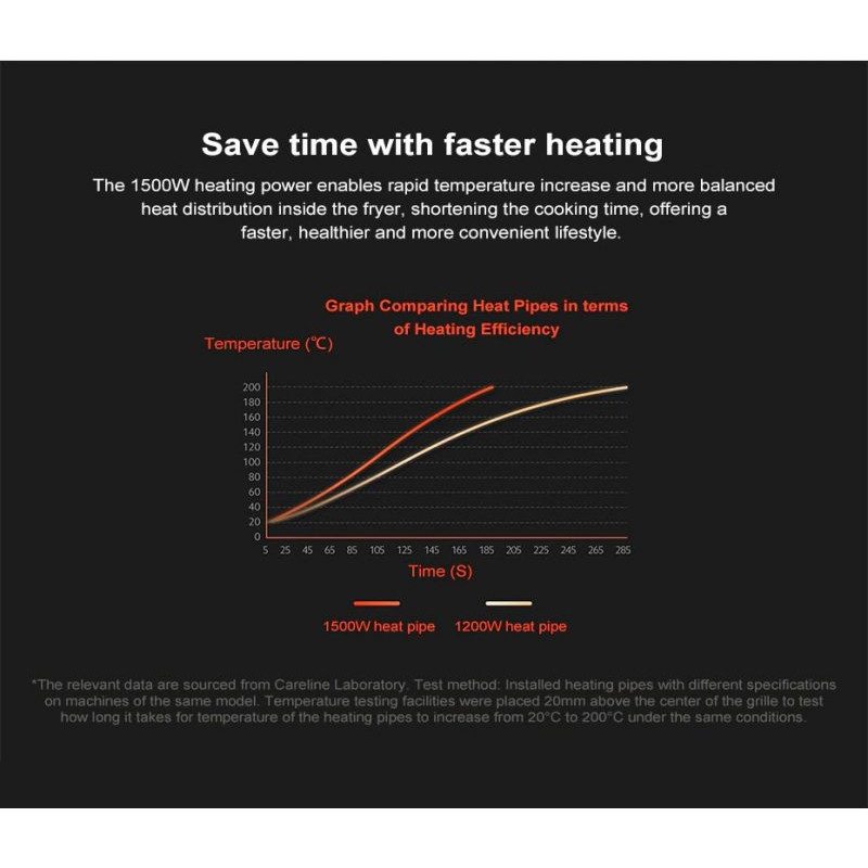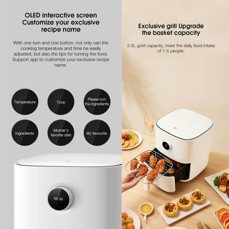 همچنین این محصول از ویژگی زمان پخت 24 ساعته با قدرت گرمایش داخلی 1500 وات برخوردار است. روی این سرخ کن یک صفحه نمایشگر OLED قرار دارد که با چرخش و فشار دادن دکمه دستگاه، میتوان وضعیت زمان پخت و دما را به راحتی تنظیم کرد یا از ویژگیهای این سرخ کن هوشمند اتصال به اپلیکشن Mi Home به حساب میآید که به راحتی می توانید آن را توسط گوشی هوشمند خود تنظیم کرده و از پخت 100 نوع غذا از طریق برنامه استفاده کرده و لذت ببرید.