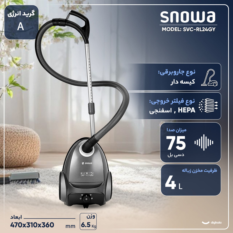 امروزه با پیشرفت تکنولوژی، برندهای مختلفی اقدام به تولید و عرضه انواع جاروبرقی کردهاند و به همین علت شاهد مدلهای مختلف این محصول در بازار هستیم. احتمالا این تنوع بالای محصول موجب سردرگمی و تردید در انتخاب بسیاری از کاربران شود. هنگام خرید یک جاروبرقی ایده آل باید به نکات زیادی از جمله مشخصات ظاهری و فنی توجه داشته باشید تا بتوانید جاروبرقی مناسب خود را انتخاب کنید. در این بخش با بررسی خصوصیات جاروبرقی رویال اسنوا به شما کمک میکنیم تا جاروبرقی مناسب خود را تهیه کنید. جاروبرقی اسنوا مدل SVC-RL24GY با ابعاد ۴۷۰×۳۶۰×۳۱۰ میلیمتر و وزن 6.5 کیلوگرم، فضای کمی را اشغال میکند و به راحتی در محلهای مختلف جانمایی میشود. این موضوع خیال شما را بابت نگهداری و جابجایی جارو در فضاهای کوچک راحت میکند. از طرفی مصرف انرژی A این جاروبرقی هزینههای شما را کاهش میدهد این محصول که در لیست قیمت جاروبرقی اسنوا رتبه خوبی دارد از توان حداکثر ۲۱۰۰ وات و مکش ۵۲۰ برخوردار است و به همین واسطه آلودگی، گرد و غبار و زبالهها را از سطوح مختلف به راحتی پاکسازی میکند. با این وجود، میزان صدای این جاروبرقی ۷۳ دسی بل است که در میان جاروبرقیهای موجود در بازار جزو محصولات بسیار کم صدا محسوب میشود. این محصول دارای سیم ۸ متری است که به شما این امکان را میدهد تا به راحتی به نقاط مختلف منزل برای تمیزکاری دسترسی داشته باشید. شعاع عملکرد این محصول ۱۱ متر است و فرصت نظافت فضاهای وسیع را فراهم میکند.