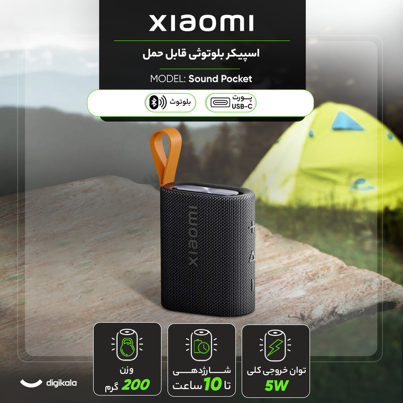 اسپیکر بلوتوثی شیائومی مدل Sound Pocket بهعنوان یکی از محصولات کمپانی شیائومی در رده اسپیکرهای قابلحمل شناخته میشود که با طراحی منحصربهفرد، ویژگیهای کاربردی و کیفیت ساخت مناسب خود توجه بسیاری از کاربران را به خود جلب کرده است. این اسپیکر با ابعاد ۹۰.۸×۷۴.۴×۴۲.۶ میلیمتر و وزن تنها ۲۰۰ گرم طراحیشده که آن را به یکی از اسپیکرهای سبک و قابلحمل در بازار تبدیل کرده است. با چنین ابعادی، این دستگاه بهراحتی در کیف یا حتی جیب جا میشود و این ویژگی به آن امکان میدهد که برای سفرهای کوتاه، پیکنیکها، دورهمیها و دیگر فعالیتهای بیرونی بهراحتی حمل شود.