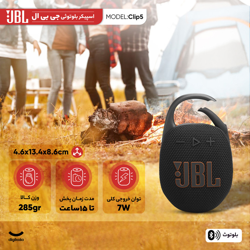 اسپیکر بلوتوثی قابل حمل جیبیال Clip 5، جدیدترین ستاره در کهکشان اسپیکرهای فوقالعاده محبوب و دوستداشتنی سری Clip جیبیال است که با هر نسل، تعریف جدیدی از ترکیب بینظیر قابلیت حمل، کیفیت صدا و دوام را ارائه میدهد. Clip 5 با ارتقاهای هوشمندانه در طراحی کارابین، بهبود قابل توجه در کیفیت و قدرت صدا با امضای JBL Pro Sound، مقاومت کامل در برابر آب و گرد و غبار با استاندارد IP67، عمر باتری طولانیتر با قابلیت Playtime Boost و بهرهگیری از جدیدترین فناوریهای اتصال مانند بلوتوث ۵.۳ با پشتیبانی از LE Audio و قابلیت شگفتانگیز اتصال چند اسپیکری Auracast، فراتر از یک اسپیکر کوچک، به یک همراه صوتی ضروری و جداییناپذیر برای تمام لحظات زندگی، از ماجراجوییهای هیجانانگیز در طبیعت گرفته تا دورهمیهای دوستانه و لذت بردن از موسیقی در خلوت، تبدیل شده است.