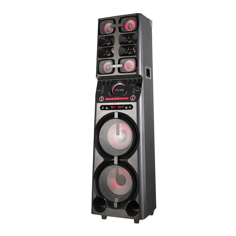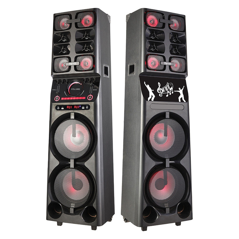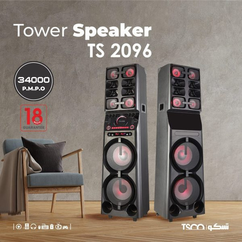 یکی از لوازم خانگی که برای برگزاری محافل و جشنها برای هر خانهای ضروریست اسپیکر پرقدرت است. با اسپیکرهای تسکو مدل TS 2096 علاوه بر یک اسپیکر قدرتمند و باکیفیت از طراحی زیبای آن نیز میتوانید لذت ببرید. با قابلیت کارائوکه در این اسپیکر با دوستان خود لحظات زیبا و خاطرهانگیزی را رقم بزنید. ابعاد این اسپیکر تسکو مناسب جا به جایی و قرارگیری در فضاهای مختلف است. این اسپیکر جذاب تسکو دارای قابلیت TWS است که برای اتصال دو بلندگو به هم به کار میرود. اسپیکرها از نوع Tower بوده و با ظاهر بسیار زیبا برای جلوه دادن به فضای شما بسیار جذاب است. با اتصال این دو اسپیکر به هم امکان پخش موسیقی فراهم میشود. در ادامه با مدل TS 2096 بیشتر آشنا خواهیم شد. دو اسپیکر با ابعاد 303×304×1303 میلیمتر مناسب قرارگیری در مجالس و فضای باغ است. یک عدد درگاه USB روی این اسپیکر قرار گرفته که برای پخش موسیقی از طریق فلش به کار میآید. روی بلندگوهای چوبی TS 2096 مجموعاً 4 عدد ساب ووفر 10 اینچی قرار دارد که با نورپردازی RGB در تاریکی جلوه زیادی به مجالس شما میبخشد. جنس این ساب ووفرها کربنی بوده و وزن آنها به صورت خالص برابر 22.95 کیلوگرم و به صورت کلی 23.95 کیلوگرم است. ساب ووفرهای این دو بلندگو به ابعاد 10 اینچ صدا را با کیفیت فوقالعادهای خارج میکنند. اسپیکرهای مشکی TS 2096 با نورپردازی RGB و طراحی زیبا مورد علاقه اکثر سلایق قرار میگیرد. دو پورت ورودی برای میکروفون این دستگاه در نظر گرفته شده است. ظاهر این اسپیکر با رقص نور موزیکال جلوه بسیار خاصی به خود میگیرد. از آنجایی که این اسپیکر دارای دارای چرخ جهت حمل و جا به جایی است حرکت دادن آن بسیار راحت است.