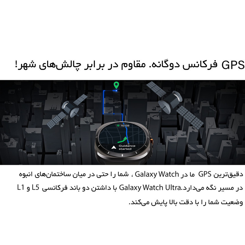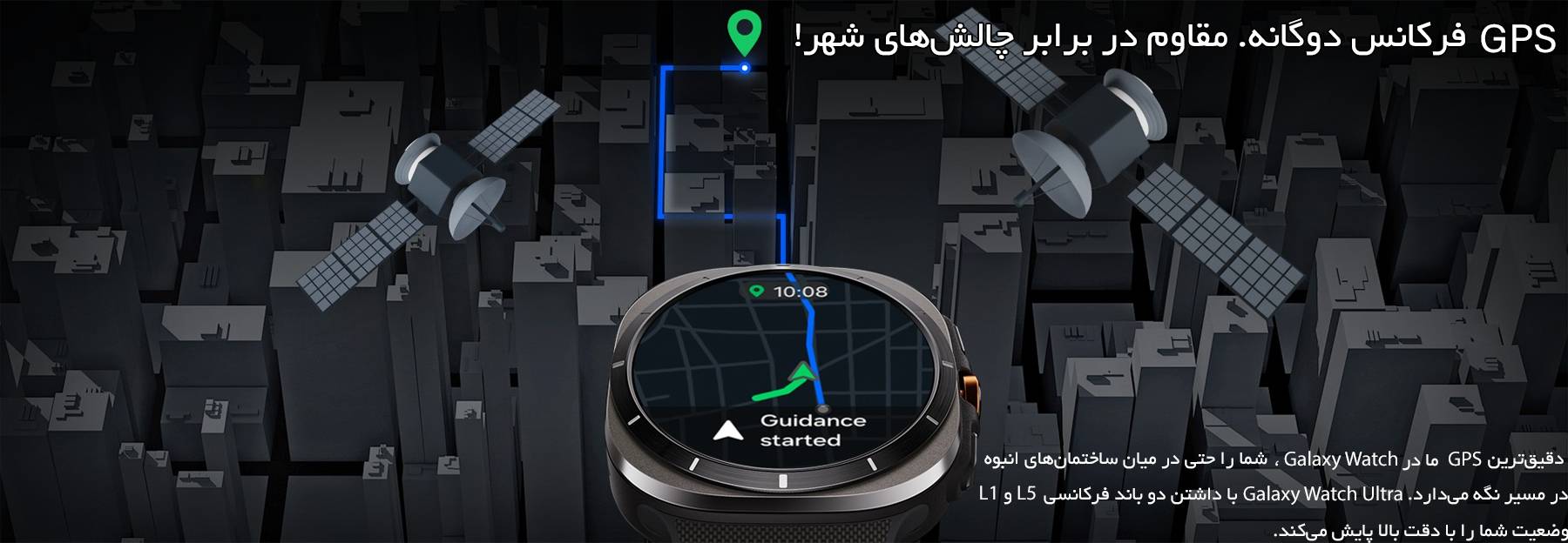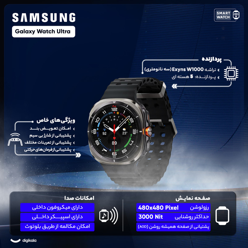 ساعت هوشمند سامسونگ مدل Galaxy Watch Ultra، یک گزینه ایدهآل برای کسانی است که به دنبال ترکیب کارایی و زیبایی در ساعت هوشمند خود هستند. این ساعت با طراحی شیک و مقاوم، بهویژه برای آقایان و بانوانی که از آن در شرایط مختلف استفاده میکنند، مناسب است. ابعاد قاب این ساعت 47.4×47.1×12.1 میلیمتر است و با وزن 60.5 گرم، بهراحتی روی مچ قرار میگیرد. فریم ساعت از جنس تیتانیوم ساختهشده که دوام بالایی دارد، درحالیکه بخش پشتی آن از سرامیک و شیشه سافایر ساختهشده تا مقاومت بیشتری در برابر خطوخش داشته باشد. این ساعت هوشمند دارای صفحهنمایش 1.5 اینچی Super AMOLED با رزولوشن 480×480 پیکسل است که تصاویری شفاف و رنگهای زندهای را نمایش میدهد. از ویژگیهای برجسته این صفحهنمایش، پشتیبانی از حالت همیشه روشن (Always on display) و حداکثر روشنایی 3000 نیت است که امکان مشاهده راحت صفحه در زیر نور مستقیم خورشید را فراهم میکند. Galaxy Watch Ultra مجهز به حسگرهای متعددی مانند سنجش ضربان قلب، سنجش اکسیژن خون، فشارسنج، شتابسنج، قطبنما و ژیروسکوپ است که امکان رصد دقیق وضعیت سلامت و فعالیتهای ورزشی شما را فراهم میآورد. همچنین، این ساعت از GPS برای مکانیابی دقیق و سیستمعامل WatchOS بهره میبرد و با سیستمعاملهای اندروید 10 و بالاتر سازگار است. با باتری 590 میلیآمپر ساعتی و قابلیت شارژ بیسیم، ساعت هوشمند سامسونگ مدل Galaxy Watch Ultra میتواند عملکرد طولانیمدت را در اختیار شما قرار دهد. همچنین، گواهی IP68 و استاندارد نظامی MIL-STD-810H این ساعت را مقاوم در برابر گردوغبار و آب تا عمق 100 متر و فشار 10 اتمسفر میکند، بنابراین میتوانید از آن در شرایط سخت و محیطهای مرطوب هم استفاده کنید.