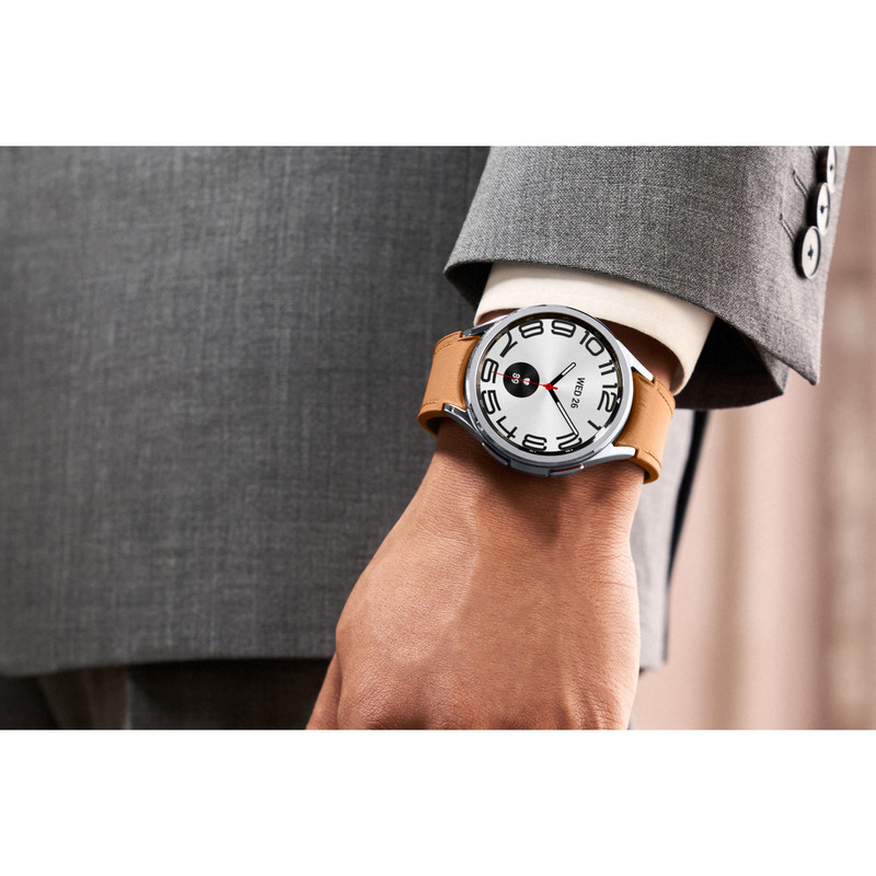 ساعت هوشمند سامسونگ مدل Galaxy Watch 6 دارای فرم دایره و قاب استیل است که در دو سایز 40 و 44 میلیمتری عرضه شده است. این ساعت هوشمند دارای دو دکمه فیزیکی در سمت راست بدنه است که یکی برای بازگشت به صفحه اصلی و دیگری برای باز کردن منوی برنامهها استفاده میشود. همچنین این ساعت هوشمند از قابلیت چرخش حلقه دور صفحهنمایش برای ناوبری در منوها بهره میبرد. صفحهنمایش این ساعت هوشمند از نوع Super AMOLED است که قادر است رنگها را با وضوح و زیبایی بالایی نمایش دهد. این صفحهنمایش با رزولوشن 480x480 پیکسل در سایز 44 میلیمتری و 432x432 پیکسل در سایز 40 میلیمتری عرضه میشود. همچنین یک لایهی محافظ گوریلا گلس DX+ مقاوم در برابر خش و ضربه نیز روی آن قرار گرفته. بند این ساعت هوشمند از جنس سیلیکون است که راحت بالایی دارد و قابل تعویض هم هست. این محصول در رنگهای مختلفی مانند مشکی، نقرهای، طلایی و بنفش عرضه شده و به دلیل پشتیبانی از استاندارد IP68 مقاوم در برابر گرد و غبار و آب تا عمق 5 متر برای مدت 10 دقیقه است. همچنین این ساعت هوشمند دارای گواهینامه MIL-STD-810G است که نشاندهندهی مقاومت در برابر شرایط سخت محیطی مانند دما، رطوبت، شوک است. ساعت هوشمند سامسونگ مدل Galaxy Watch 6 با سیستمعامل Wear OS 4 از گوگل کار میکند که نسبت به نسخههای قبلی این سیستمعامل از بهبودهای زیادی برخوردار است. این سیستمعامل از هماهنگی بهتر با گوشیهای اندرویدی، دسترسی به بیشترین تعداد برنامههای موجود برای ساعتهای هوشمند، امکان استفاده از دستیار صوتی گوگل و قابلیتهای متنوع دیگری برخوردار است.