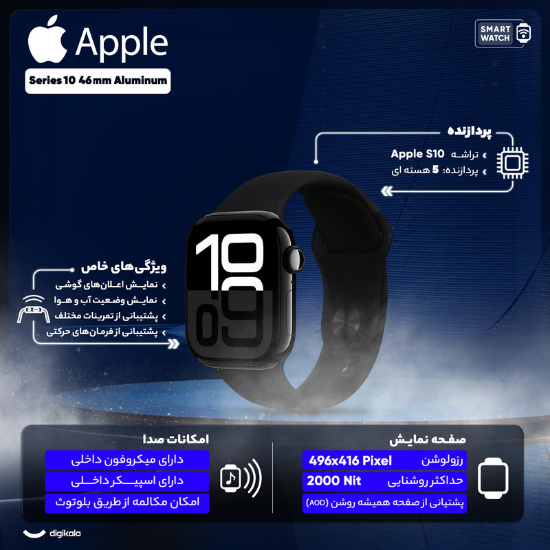 ساعت هوشمند اپل مدل Series 10 با ابعاد 46x39x9.7 میلیمتر و وزن 35.3 گرم، محصولی مناسب برای آقایان و بانوان است که هم در فعالیتهای روزمره و هم در موقعیتهای رسمی و ورزشی قابل استفاده است. جنس بدنه این ساعت از آلومینیوم بوده و در ساخت آن از شیشه Ion-X و سرامیک سافایر بهره گرفته شده است. صفحه نمایش 1.96 اینچی آن از نوع Retina LTPO3 OLED با وضوح 416x496 پیکسل و تراکم 326 پیکسل بر اینچ بوده که قابلیت روشنایی بین 1 تا 2000 نیت را دارد. این ساعت با سیستم عامل WatchOS نسخه 11 و پردازنده Apple S10 عرضه شده و از فناوریهای مکانیابی GPS، A-GPS، GLONASS، GALILEO، BDS و QZSS پشتیبانی میکند. ساعت هوشمند اپل مجهز به حسگرهای متعددی از جمله قطبنما، شتابسنج، ضربان قلب، سنجش اکسیژن خون، ژیروسکوپ، ارتفاعسنج و سنجش دمای بدن است. همچنین، قابلیت نمایشگر همیشه روشن، پایش وضعیت خواب، محاسبه کالری مصرفی و مسافت طیشده، تشخیص تصادف و سقوط از ارتفاع و پشتیبانی از Siri از دیگر ویژگیهای این محصول است. باتری لیتیوم یونی این ساعت با یک بار شارژ میتواند تا 18 ساعت در حالت عادی و 36 ساعت در حالت ذخیره انرژی کار کند. بهعلاوه، این ساعت در برابر آب تا عمق 50 متر مقاوم است و دارای گواهی IPX6 برای مقاومت در برابر گرد و غبار است. گفتنیست که قابلیت استفاده از سنسور اکسیژن خون وجود ندارد.