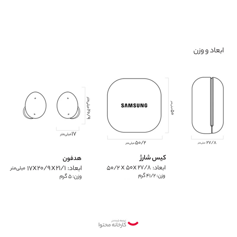 | سایر مشخصات | دارای چیپست پردازشی BES2500ZPقابلیت پشتیبانی از اندروید 7 به بالا با 1.5 گیگابایت رم (RAM) به بالااسپیکر دوگانه، حذف نویز فعال، استاندارد IPX2، میکروفن سهگانه، پشتیبانی از Bixby، شارژ بدونسیمعمر باتری محفظه شارژ در حالت مکالمه: 13 ساعت با فعال بودن ANC و 14 ساعت با خاموش بودن ANCعمر باتری محفظه شارژ در حالت پخش موسیقی: 20 ساعت با فعال بودن ANC و 29 ساعت با خاموش بودن ANCپخش 40 دقیقه با 3 دقیقه شارژ (Wired, Wireless, D2D)پخش 60 دقیقه با 5 دقیقه شارژ (Wired, Wireless, D2D)پخش 150 دقیقه با 10 دقیقه شارژ (Wired, Wireless)دارای سنسورهای شتاب سنج (Accelerometer)، ژیروسکوپ (Gyro)، مجاورت (Proximity)، آهنربا (Hall)، تماسهای لمسی دست (Touch)، واحد سنجش صدا (VPU(Voice Pickup Unit))پروفایلهای بلوتوث: HFP ،A2DP ،AVRCPکدک (Codec) صدا: Scalable (Samsung proprietary) ،AAC ،SBCدارای 3 عدد میکروفن (VPU)اسپیکر: Dynamic 2 Way : Woofer & Tweeterدارای سیستمعامل RTOS |