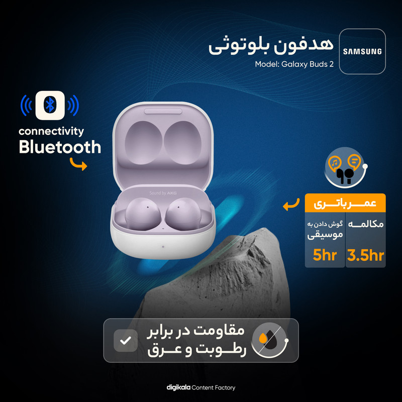 باتری هدفون بیسیم Galaxy Buds 2 نیز از نظر عمر مفید بسیار عالی است. با یک شارژ کامل، میتوانید تا 5 ساعت موسیقی گوش کنید و با موردی که اشاره کردید، با 3 دقیقه شارژ، میتوانید تا 10 موزیک گوش کنید. همچنین، با استفاده از قاب شارژ، میتوانید هدفونهای خود را تا 20 ساعت دیگر شارژ نمایید. این ویژگی بسیار مناسب است و امکان استفاده طولانی مدت از هدفون بدون نیاز به شارژ مکرر را فراهم میکند. هدفون بی سیم سامسونگ مدل Galaxy Buds 2 یک دستگاه هدفون بیسیم است که از اندروید ۷ به بالا با ۱.۵ گیگابایت رم به بالا سازگار است. این هدفون دارای اسپیکر دوگانه است که باعث تجربهی گوش دادن بهتر میشود. همچنین دارای قابلیت حذف نویز فعال (ANC) است که باعث کاهش نویزهای محیطی و بهبود کیفیت صدا میشود. همچنین این هدفون دارای استاندارد IPX۲ است که به آن مقاومت در برابر آب و رطوبت را میدهد.