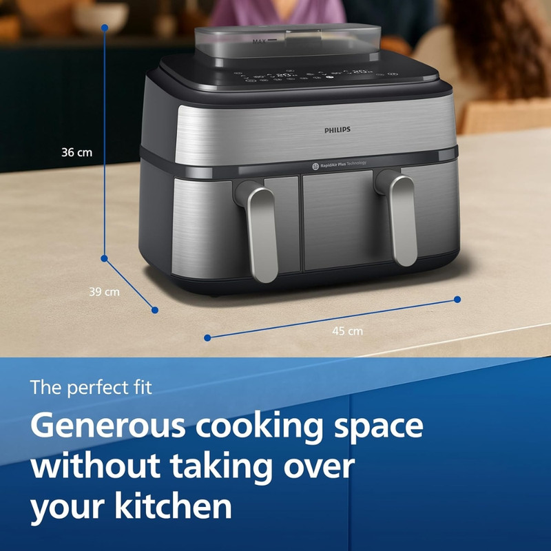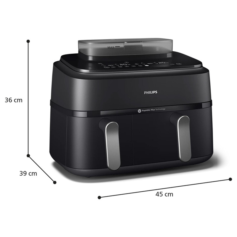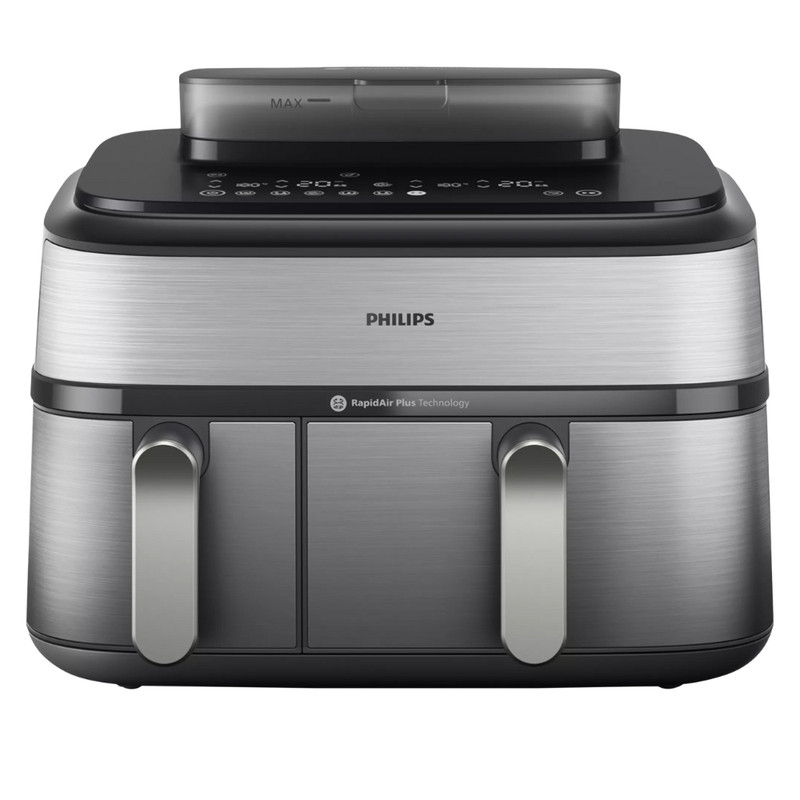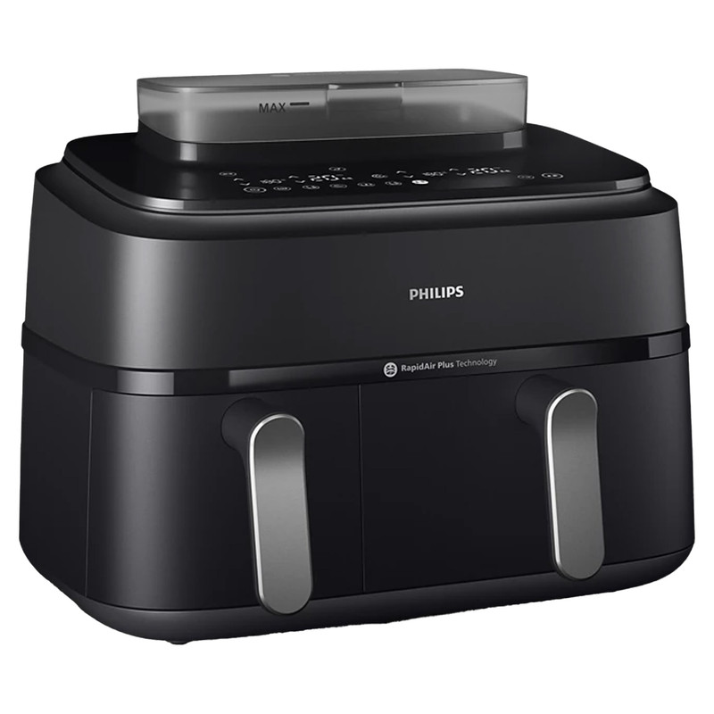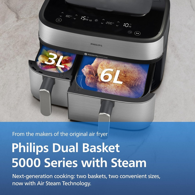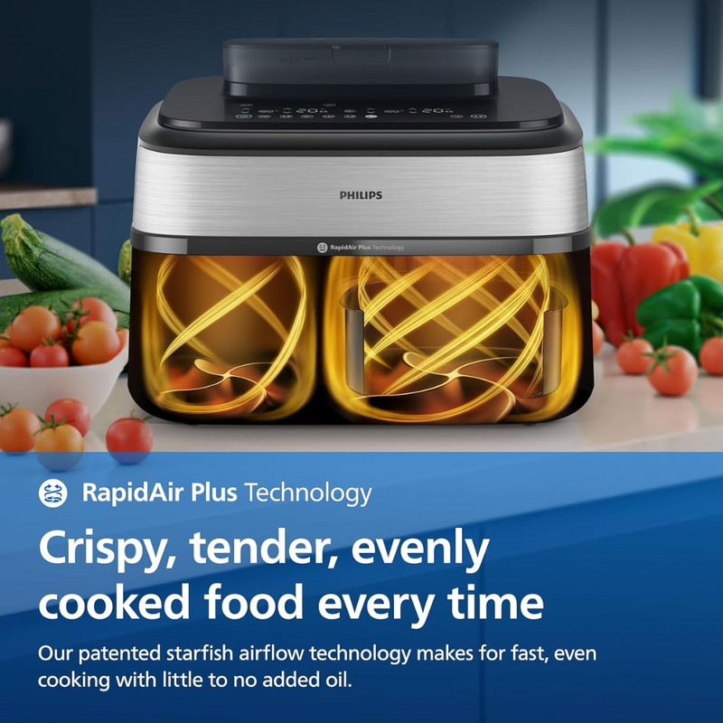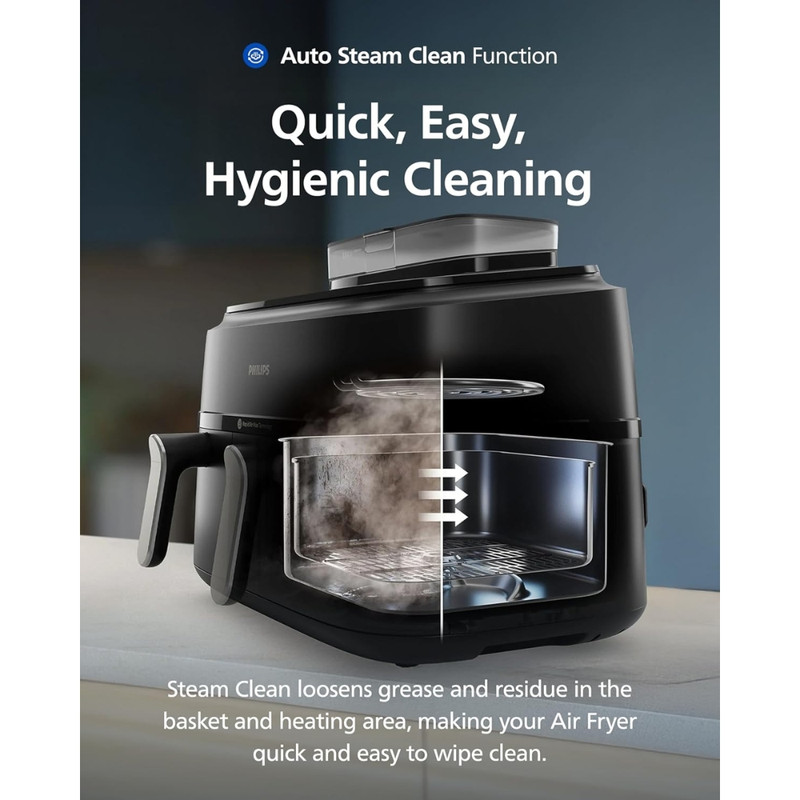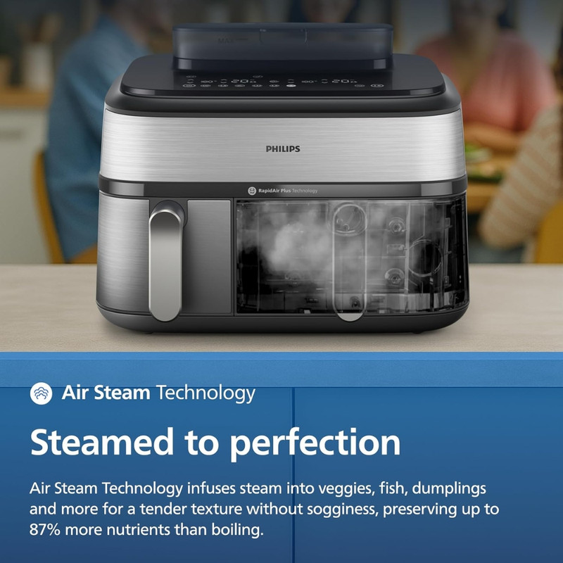 | سایر توضیحات | فناوری RapidAir Plus و Air Steam برای پخت بهتر با حفظ رطوبت مواد غذایی /قابلیت پخت دوکاره: بخارپز و سرخکن /قابلیت تنظیم تایمر تا ۶۰ دقیقه /۱۲ برنامه پیشفرض برای پخت متنوع /دارای دو سبد جداگانه برای پخت غذاهای مختلف /سبد بزرگ با ظرفیت ۶ لیتر و سبد کوچک با ظرفیت ۳ لیتر /یکی از سبدها مجهز به قابلیت بخارپز /دارای قابلیت Auto Steam clean برای تمیز کردن راحتتر چربی باقیمانده از پخت مواد غذایی |