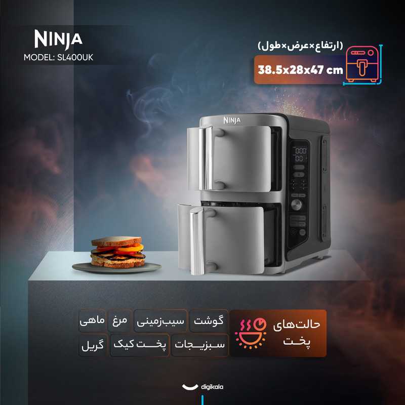 برند نینجا، نامی که در دنیای لوازم آشپزخانه با نوآوریهای جسورانه، قدرت بیرقیب و تطبیقپذیری شگفتانگیز گره خورده است، همواره در تلاش بوده تا با ارائهی محصولاتی پیشرفته، فرآیند آشپزی را برای خانوادههای مدرن، سادهتر، سریعتر و لذتبخشتر کند. سرخکن بدون روغن ۹.۵ لیتری نینجا مدل SL400UK، تجسمی کامل از این فلسفه و تعهد است. این دستگاه، فراتر از یک هواپز معمولی، یک سیستم آشپزی چند منظوره و یک مرکز فرماندهی واقعی در آشپزخانهی شماست که با ظرفیت عظیم، ۶ برنامهی پخت هوشمند، توان ۲۴۷۰ واتی و فناوریهای پخت پیشرفتهی نینجا، به شما امکان میدهد تا انواع غذاهای خوشمزه، سالم و متنوع را برای تمام اعضای خانواده یا مهمانان خود، با کمترین میزان روغن و در کوتاهترین زمان ممکن، به شیوهای خلاقانه و بیدردسر آماده کنید.