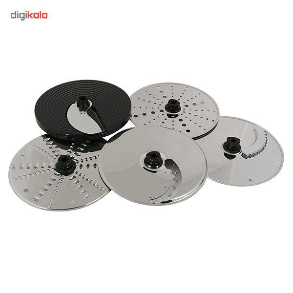 رنده: این دستگاه دارای پنج دیسک رنده است که از جنس استیل ضدزنگ ساخته شدهاند. قطر دیسکها حدود 18 سانتیمتر و بسیار بزرگ است. اندازهی بزرگ دیسکها کمک میکند موادغذایی با سرعت بسیار زیاد رنده شوند. دیسکهای دوطرفه قابلیت رندهکردن بهصورت ریز و درشت را دارند و دیسک ورقهکن قابلتنظیم در پنج سطح است و میتوان ورقههایی با ضخامت 1 تا 7 میلیمتر از موادغذایی را بسته به نوع استفاده تهیه کرد. دو دیسک نیز برای خلالکردن و رشتهکردن انواع موادغذایی همراه دستگاه است.