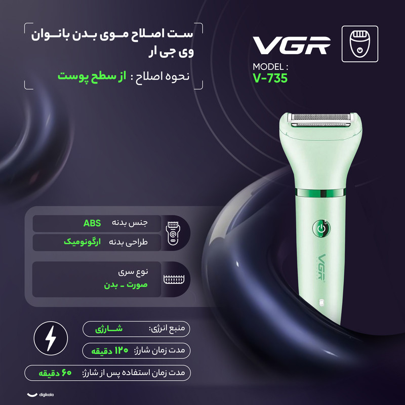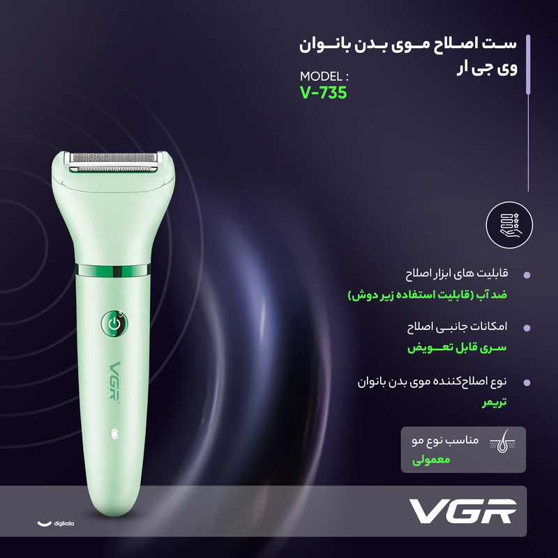 ست اصلاح موی بدن بانوان وی جی آر مدل V-735 یک تریمر با طراحی کاربردی و ارگونومیک است که تجربهای راحت و دقیق از اصلاح موها ارائه میدهد. این دستگاه با نحوه اصلاح از سطح پوست و تماس مستقیم تیغهها، مناسب استفاده روی صورت و بدن طراحی شده است. تیغهها از استیل ضدزنگ ساخته شده و در مجموعه شامل ۳ تیغه با قابلیت تعویض هستند تا برای انواع نیازهای اصلاح، عملکرد مناسبی داشته باشند. تریمر با باتری لیتیوم یون قابل شارژ عرضه شده و پس از ۱۲۰ دقیقه شارژ، حدود ۶۰ دقیقه استفاده مداوم فراهم میکند. از ویژگیهای ایمنی و مراقبتی این دستگاه میتوان به ضد آب بودن برای استفاده زیر دوش و اقلام همراه مانند برس تمیزکننده، روغن و شانههای مختلف اشاره کرد که نگهداری و اصلاح دقیق را سادهتر میکنند. بدنه از جنس ABS بوده و طراحی ارگونومیک آن استفاده طولانیمدت را راحت میسازد.