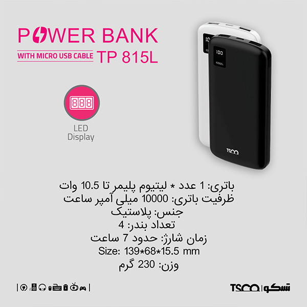 پاوربانک تسکو مدل TP 815L یک شارژر همراه کارآمد و خوشساخت است که برای افرادی طراحی شده که در طول روز به یک منبع انرژی مطمئن و قابل حمل نیاز دارند. این مدل از باتری لیتیومپلیمری استفاده میکند که به دلیل وزن کمتر، پایداری مناسب و دوام قابل قبول، انتخاب رایجی در میان پاوربانکهای مدرن به حساب میآید. این پاوربانک با ظرفیت ۱۰ هزار میلیآمپرساعت برای شارژ انواع دستگاهها از جمله گوشی موبایل، تبلت، دوربین و اسپیکر بلوتوثی کاربرد دارد و امکان شارژ چندینبارهی اغلب گوشیهای هوشمند را فراهم میکند.بدنهی TP 815L از پلاستیک مقاوم ساخته شده و وزن ۲۳۰ گرمی آن حمل و استفاده روزمره را آسانتر میکند. طراحی جمعوجور و ابعاد ۱۳.۹ در ۶.۸ در ۱.۵ سانتیمتر باعث شده پاوربانک بهراحتی در کیف، کوله یا حتی جیب قرار گیرد. روی بدنه نشانگر LED تعبیه شده است که میزان شارژ باقیمانده را به صورت دقیق نمایش میدهد و استفادهی کاربر را در مدیریت انرژی سادهتر میکند. این مدل به چهار پورت خروجی USB-A مجهز شده و امکان شارژ همزمان چند دستگاه را فراهم میآورد. هر پورت حداکثر توان ۱۰ وات ارائه میدهد که برای شارژ استاندارد و ایمن انواع دستگاهها مناسب است. یکی از مزیتهای این پاوربانک، داشتن دو درگاه ورودی MicroUSB و USB-C است که هر دو با شدت جریان ۲ آمپر توان شارژ دستگاه را تأمین میکنند. این ویژگی باعث میشود کاربر در انتخاب نوع کابل برای شارژ پاوربانک محدود نشود. توان خروجی کلی TP 815L برابر ۱۰ وات است که برای استفادهی روزمره، سفرهای کوتاه، محیط کار یا دانشگاه گزینهای مناسب به حساب میآید. این مدل هیچ قابلیت مقاومتی یا تکنولوژی محافظتی پیشرفته ندارد؛ با این حال، عملکرد آن در سطحی پایدار طراحی شده است و بهعنوان یک پاوربانک اقتصادی، نیاز کاربر را در زمینه شارژ دستگاهها برطرف میکند. پاوربانک همراه با یک کابل MicroUSB ارائه میشود و کاربران میتوانند بسته به نوع دستگاه خود از کابلهای دیگر نیز استفاده کنند. TP 815L انتخابی ایدهآل برای افرادی است که به دنبال یک پاوربانک سبک، ساده و قابل اعتماد هستند و نمیخواهند هزینهی زیادی برای قابلیتهای پیشرفته پرداخت کنند.